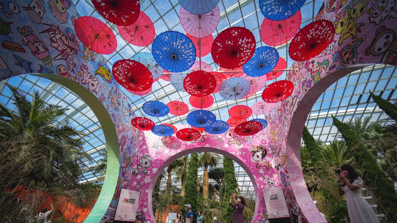 These colourful tokidoki characters are interspersed in a landscape featuring torii gates, hanami settings, Japanese floral art by Ikebana International Singapore, and a display of Japanese carp streamers known as koinobori on loan from the Japanese Association, Singapore. Visitors can take in the ephemeral beauty of cherry blossoms as they explore a magical giant box with marumado, or traditional round Japanese windows with a view.