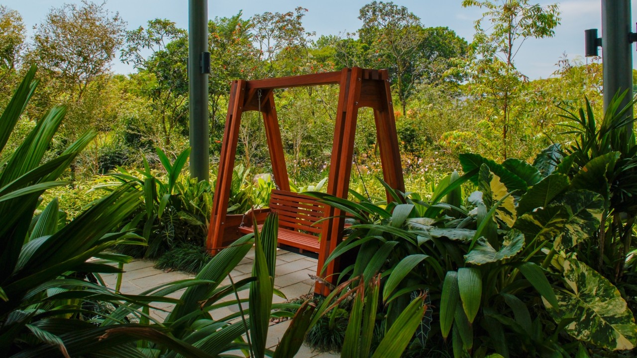 Benches throughout the Sustainability Gallery and the swing are crafted with repurposed wood from trees in Singapore by local carpentry studio Roger&Sons, giving new life to materials that would otherwise go to waste. These pieces are crafted from locally salvaged Khaya senegalensis, a species of mahogany known for its rich reddish-brown colour, hardness and strength. The design showcases the wood's natural form and versatility.