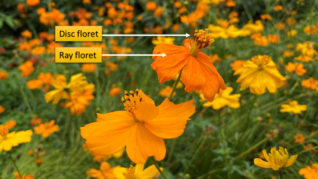 Did you know that the flower you are looking at is actually a head (also known as a capitulum) composed of many small florets? In this type of inflorescence, the individual small flowers are rendered conspicuous by aggregation into heads, which then becomes further attractive with the development of ray florets. The marginal strap-shaped flowers (ray florets) are sterile, whereas the central tubular flowers (disc florets) are bisexual and fertile.