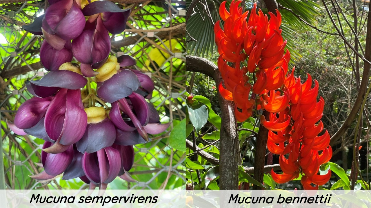 These woody vines (lianas) are in the Papilionoideae subfamily of legumes, named for their butterfly-like flowers (papilio means ‘butterfly’ in Latin). Find both of these Mucuna species at Gardens by the Bay. M. sempervierens is in Cloud Forest and the New Guinea creeper or scarlet jade vine (M. bennettii) is on trellises near the Floral Clock, Supertree Grove, and a bridge above the koi pond.