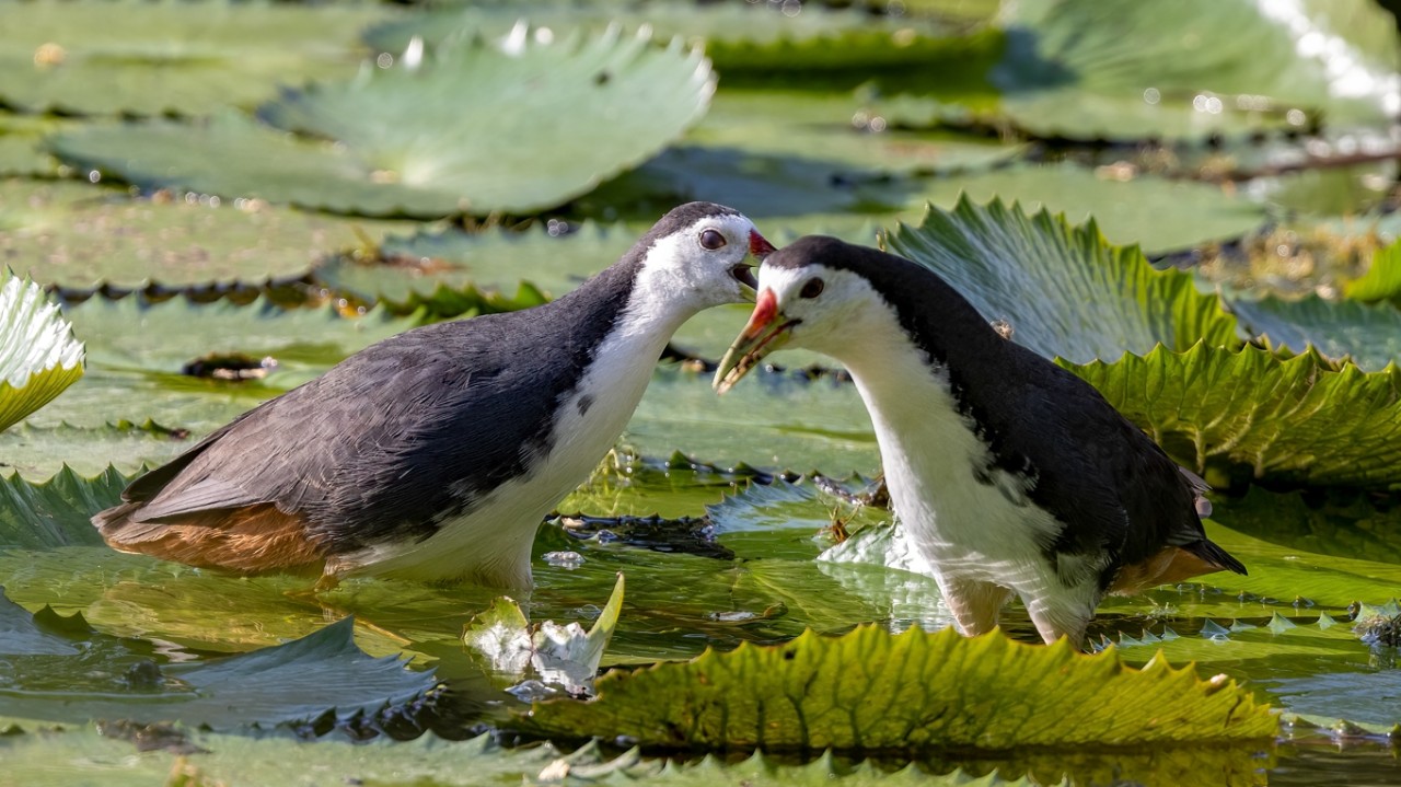 A waterbird of the rail and crake family, Rallidae, but less shy or secretive than its relatives, it can often be found foraging in the open, singly or in pairs, along the edge of a waterbody, in drains near busy roads or paths, or clambering up low vegetation. Reeds or undergrowth are no obstacle to the white-breasted waterhen as its body is able to flatten laterally for ease of movement. Probing with its bill in mud or shallow water, or picking up food it sees, it feasts mainly on insects, small fish, aquatic invertebrates and grains or seeds.
