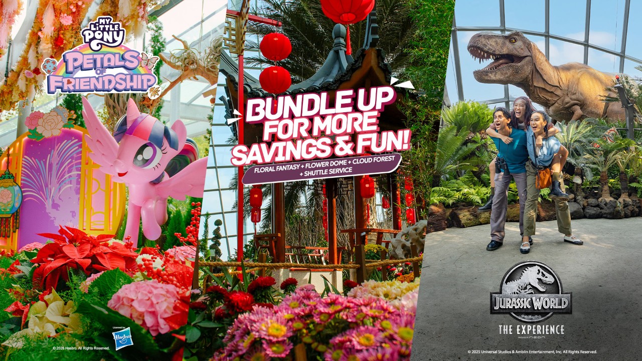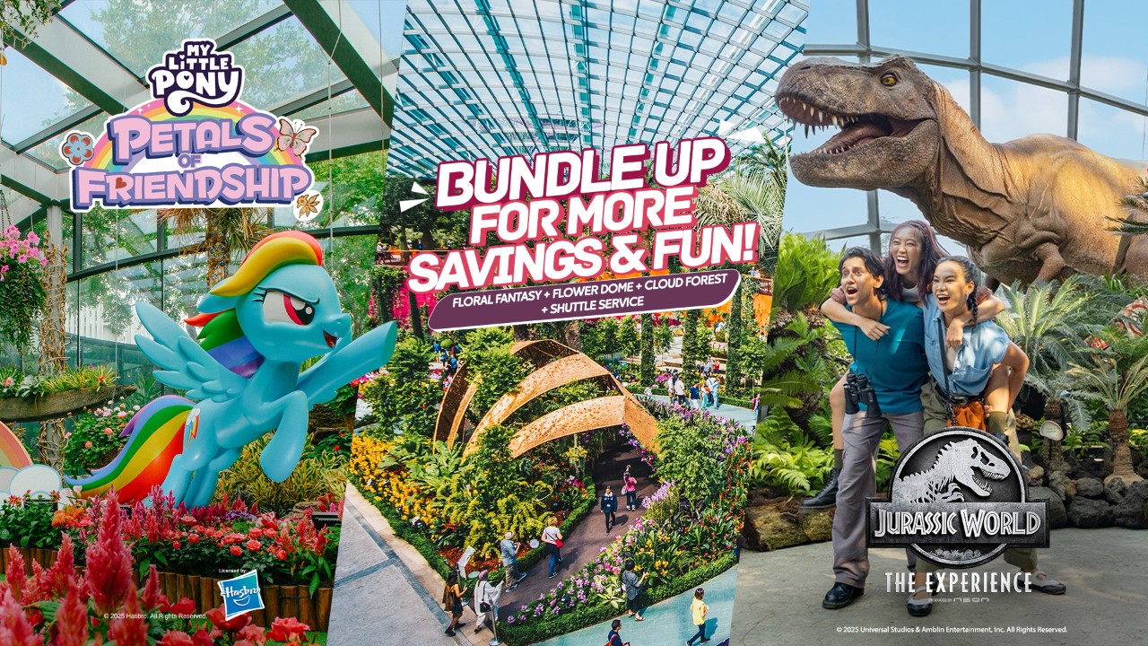 Experience the best of our Gardens with one amazing bundle. Explore stunning floral displays in Flower Dome, come face-to-face with life-sized dinosaurs at Cloud Forest featuring Jurassic World: The Experience, and step into the world of colour and wonder at MY LITTLE PONY at Floral Fantasy. With Shuttle Service included to ease your journeys, we’ve got you covered!